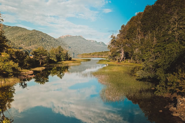 Área del Lago Lácar: De origen glacial, la hoya lacustrina se extiende hacia el norte. Varios ríos y arroyos alimentan el lago que desagua hacia el Pacífico a través del río Hua Hum, su emisario natural.
